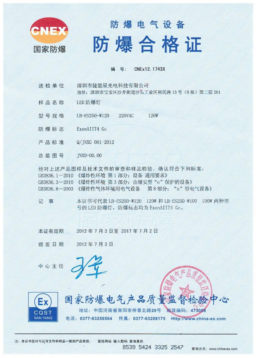 捷能星是國家級高新技術企業經過iso9001質量體系認證,“LED防爆燈”經國家防爆CNEX認證,編號:CNEx12.1743X,以安全、節能、長壽命的口碑享譽國內外。