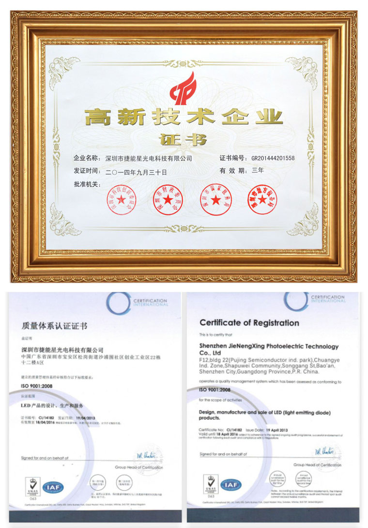 捷能星作為國(guó)家級(jí)高新技術(shù)企業(yè)在國(guó)內(nèi)外大功率LED照明市場(chǎng)已占據(jù)很大的市場(chǎng)份額,已申請(qǐng)專(zhuān)利30多項(xiàng),產(chǎn)品已通過(guò)美國(guó)UL、DLC、歐盟CE、日本PSE、FCC、SAA、ROSH等國(guó)際認(rèn)證。捷能星期待與全球的合作伙伴共創(chuàng)Led照明行業(yè)的美好未來(lái)。